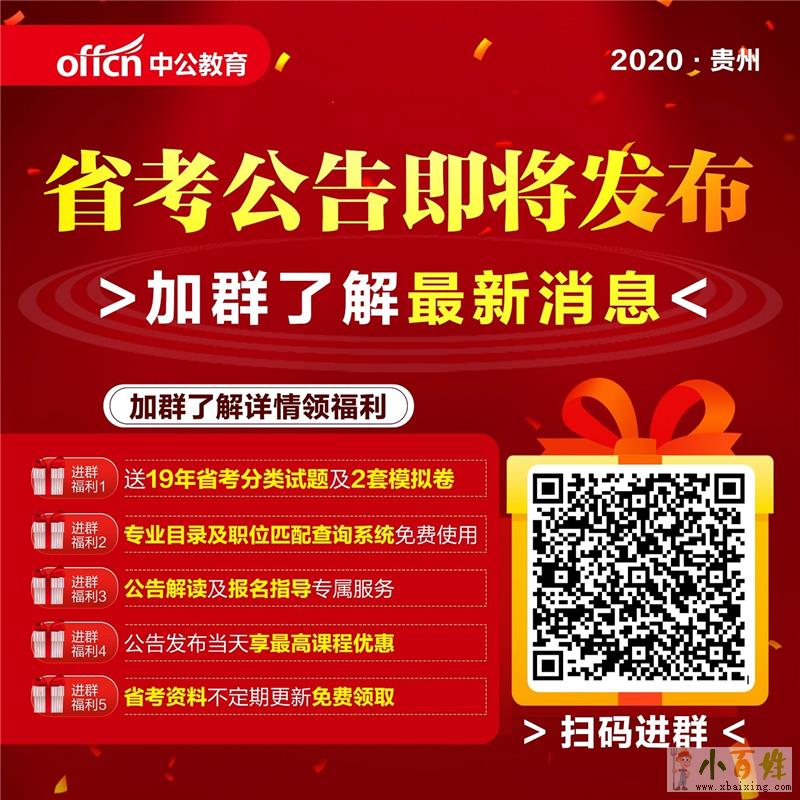 2020年贵州省考公告即将发布,微信扫码进群,了解更多考试详情,领取相关备考资料来源www.xbaixing.com