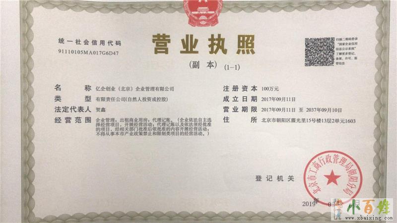 亿企创业(北京)企业管理有限公司是北京市财政局批准设立的专业代理机构,是一家以从事工商注册代理、会计服务、税收咨询、企业人事代理、投融资服务为主要业务的专业咨询服务机构小+百+姓+网。公司以“诚信、快捷、务实”为原则,打造企业成长的综合服务平台,我们凭借着在北京建立的广泛业务关系网和丰富的专业经验,为各层面、各行业的客户提供优质而高效的服务x_b_a_i_x_i_n_g_c_o_m。可为客户解决公司注册时面临的各种疑难问题