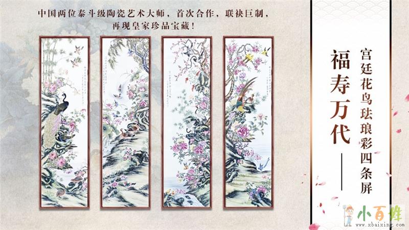 《福寿万代·宫廷花鸟珐琅彩四条屏》是中国两位泰斗级陶瓷艺术大师、非物质文化遗产传承人、古陶瓷专家——蓝国华、王国喜首次联袂创制。福寿万代四条屏由春、夏、秋、冬四幅组成,严格采用宫廷珐琅彩制瓷工艺制作而成,每幅瓷板画都配有大师的亲笔题诗签名和落款。CjZ