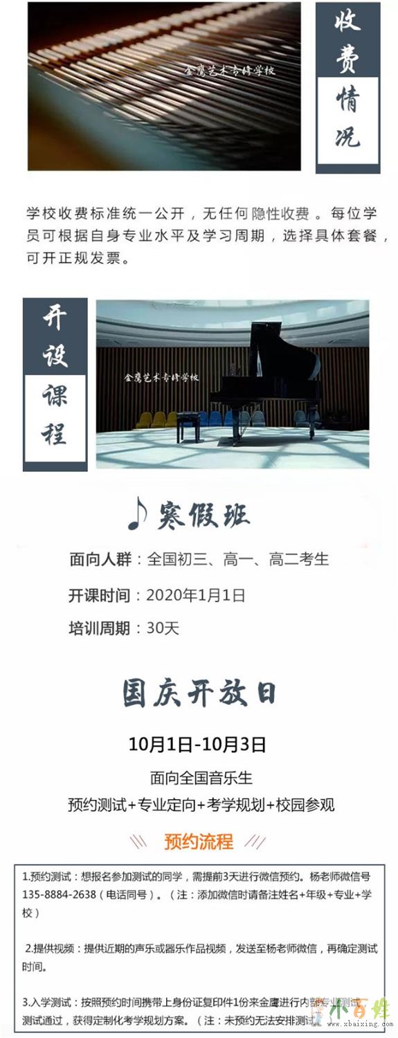 杭州金鹰艺术专修学校(简称金鹰)于国庆节开设开放日(10月1日——10月3日):预约测试+专业定向+考学规划+校园参观,旨在帮助来自全国各地的音乐艺考生明确艺考方向x b a i x i n g c o m。