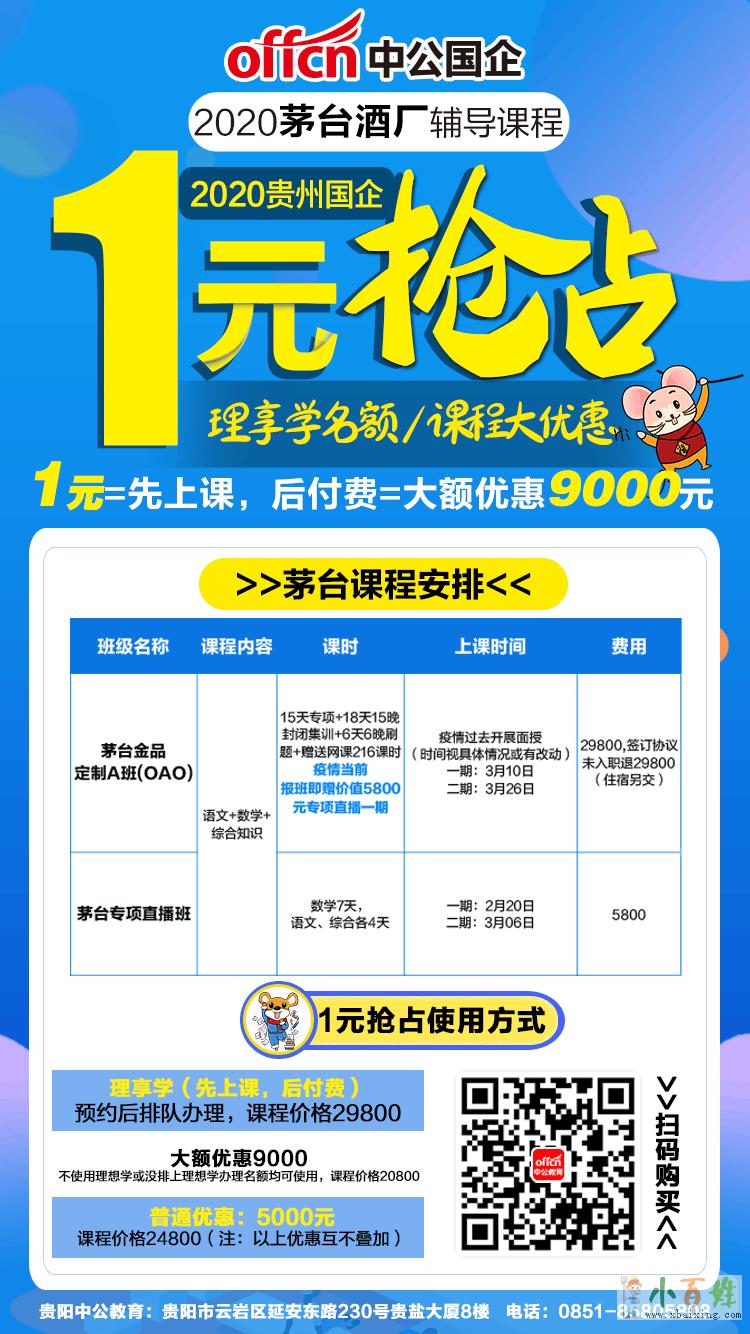 为此,中公教育为您设置了实惠且合理的课程,2020贵州茅台酒厂1元理享学辅导课程,1元抢占0元入学资格,备考国企,先人一步,名额有限,先到先得,小伙伴们有需要的联系我呀!