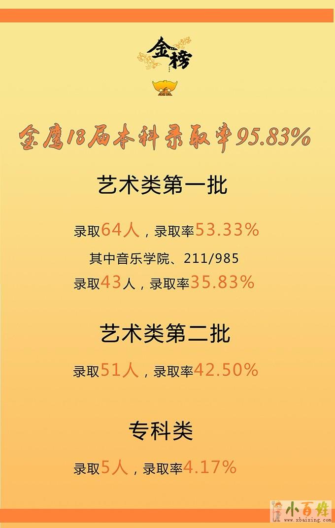 杭州金鹰艺术专修学校自2004年办学以来,用专业和成绩赢得了全国各地学生及家长的广泛认可,培养出了一大批优秀音乐人才。2018届本科录取率高达95.83%,其中音乐学院及211/985录取率35.83%。