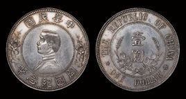 孙中山开国纪念银币,即中华民国孙像开国纪念币银元,正面中央为孙中山侧面肖像,边缘内上镌中文隶书体"中华民国"4字、下镌"开国纪念币"5字、左右长枝花饰。