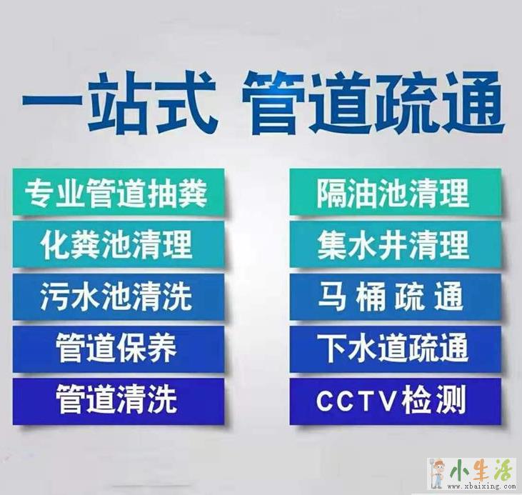 专业机械疏通室内外各种大小下水管道,马桶,蹲坑,地漏,浴缸,菜池及各种疑难下水道等小生活网www.xbaixing.com。