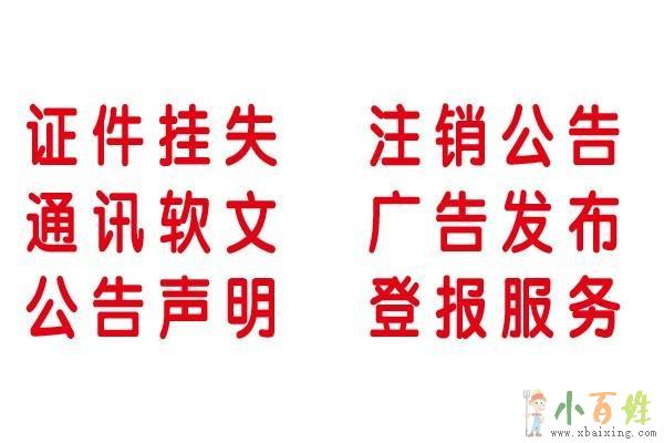 1.确定登报的报纸类型,根据自己刊登的内容性质,选择相关部门认可的省市级或者其他报纸类型进行刊登;准备登报所需的必备证件x_b_a_i_x_i_n_g_c_o_m。 2.选择地方登报中心或者报业集团在线,进行在线电话咨询欢迎www.xbaixing.com。 3.根据登报的内容选择登报模板进行登报内容的格式以及排版调整,发送给登报中心小 百 姓 网。 4.根据排版后的行数或者字数计数的价格进行付款,并提供相关证件备案x b a i x i n g c o m。 5.登报中心根据选定的档期进行登报发行xbaixing.com。 6.登报中心收集两份左右(根据需要)登报的报纸,标出登报位置小_百_姓_网。与发票一起邮寄到顾客手中欢迎www.xbaixing.com。
