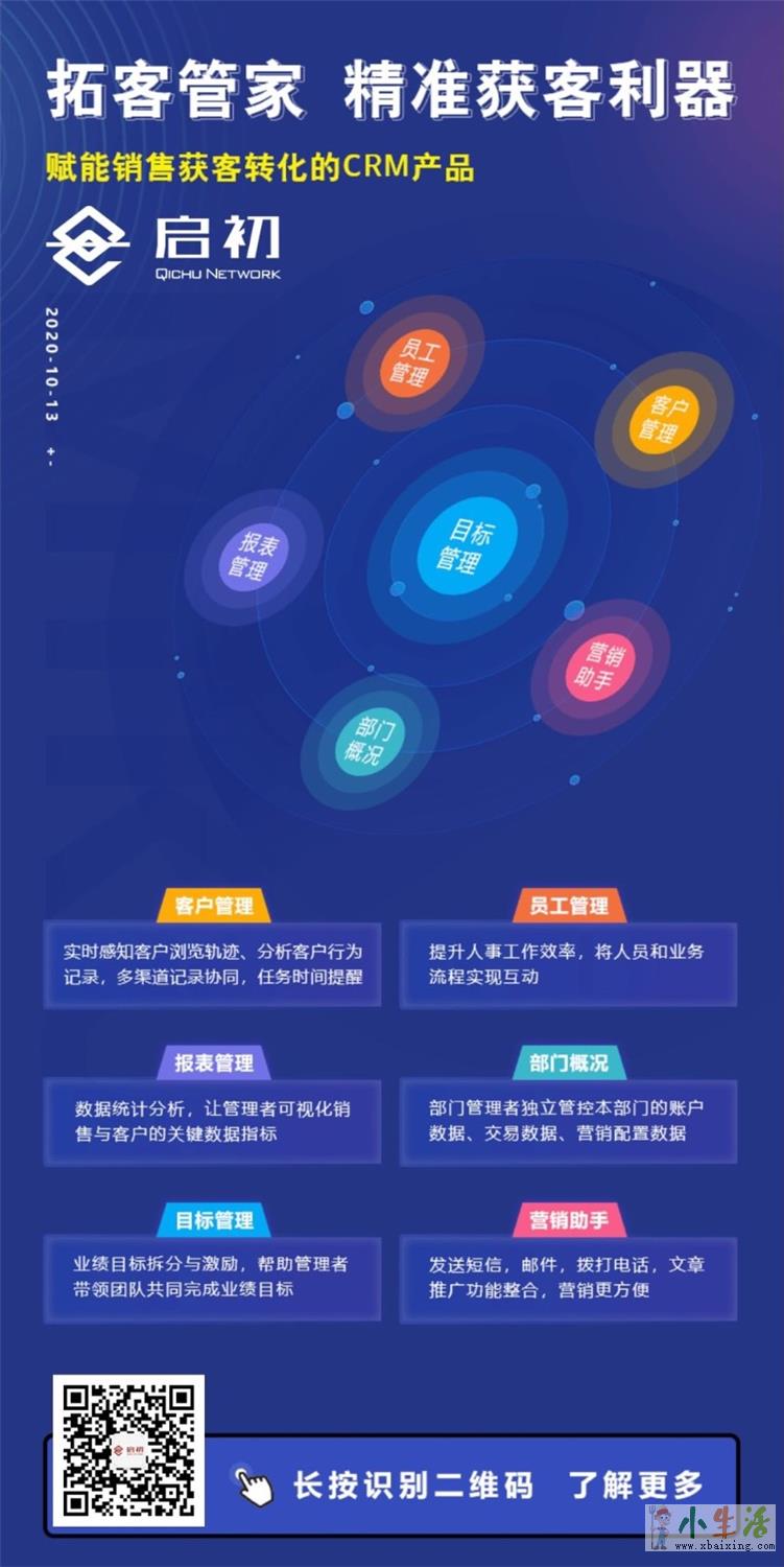 一款带有6种软件功能的新产品。客户管理,员工管理,报表管理,部门概况,目标管理,营销助手6大功能,让线上办公轻松线下拓客易如反掌。小 生 活 网