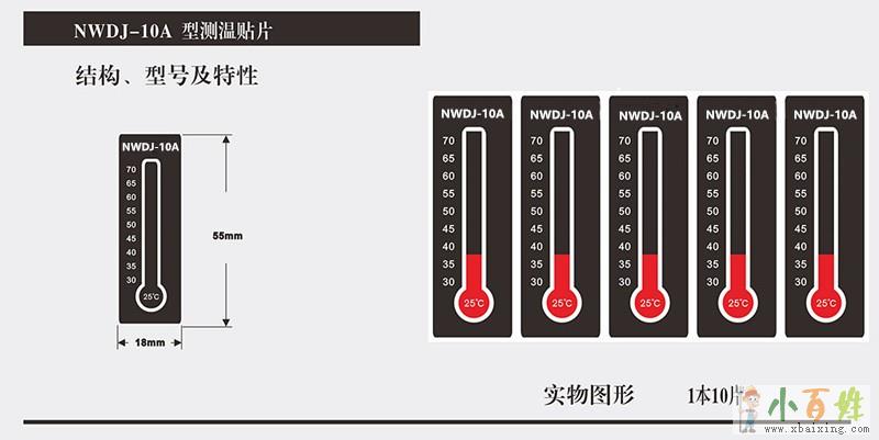NWDJ-10A型可逆型变色温度标签具有独特的变色示温、数字显示及所变颜色可逆功能,自身带有不干胶小~百~姓~网。应用于变电所室内母线的连接部位,也可贴在母线与设备接线端子的连接处及隔离开关的触头上,还可贴在变压器、电机、电容器等电气设备的外壳上。用来监视测温部位的温度变化。一旦监测部位温度达到或超过温度标签的额定温度,变色温度标签相应的温度格将快速地由黑色变红色。很容易被巡视中的工作人员发现该部位温度升高的状况,从而找出故障隐患,防止事故的发生。如监测部位温度过高,温度标签就快速变色欢迎www.xbaixing.com。监测部位温度冷却下来后,温度标签会缓缓恢复原来的颜色。该温度标签仍可继续使用。