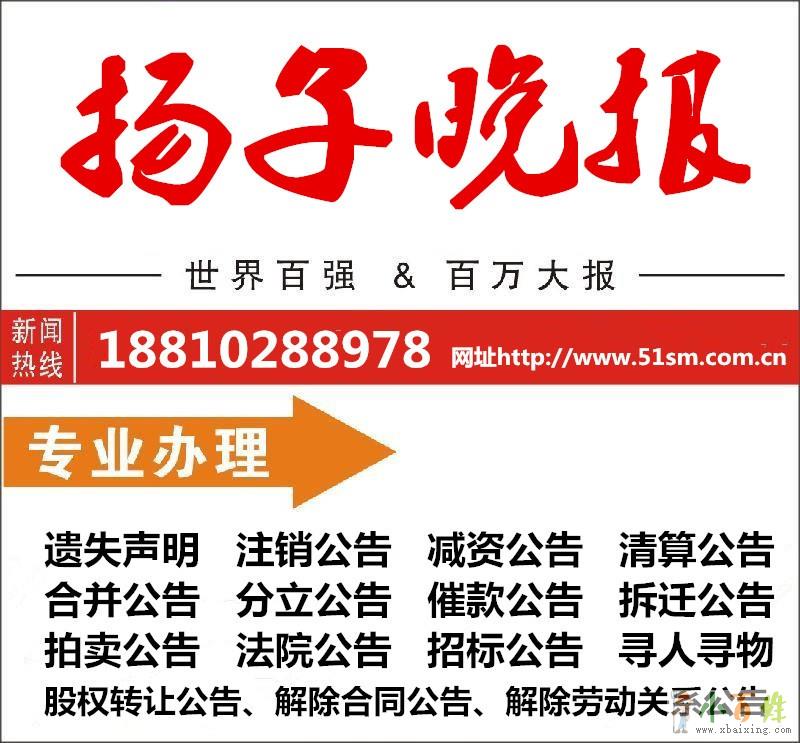 扬子晚报,登报遗失声明要多少费用,怎么登报办理?求知情者告知专业报纸遗失公告、声明公告、分类公告等项目xyiJ。