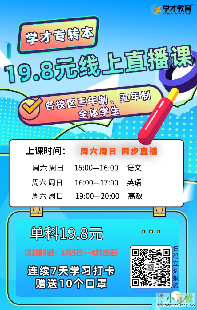 朋友们,即日起报名江苏学才教育直播课,仅19.8元,只要学习打卡7天,就可以获得10个口罩哦~是不是超级划算呀!欢迎www.xbaixing.com