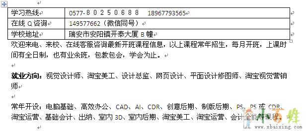 常年开设:电脑基础、高效办公、CAD、AI、CDR、创意后期、制版后期、PS、PS或CDR、淘宝运营、基础会计、出纳、室内3D、室内后期、淘宝美工、淘宝运营、会计全能等课程x_b_a_i_x_i_n_g_c_o_m。