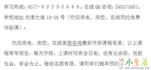 学习热线:0577-80250688;在线QQ咨询:348575681;学校地址 龙港大道18-36号(欢迎来电、来校、在线预约免费体验课)