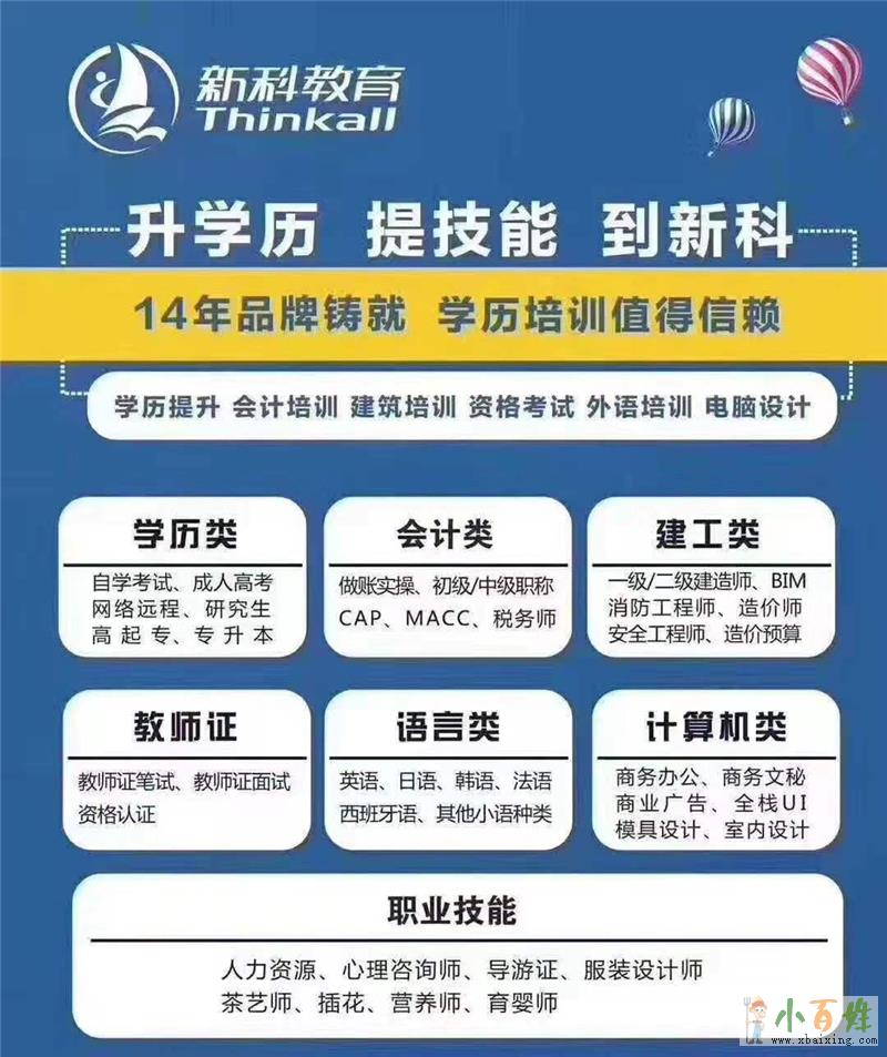 新科教育创立于2005年,是在教育局注册颇具影响力的教育培训集团,拥有8大培训基地,60余所分校,遍布苏州、太仓、江阴、张家港、常熟、常州、丹阳、南通、浙江、安徽、上海等地x~b~a~i~x~i~n~g~c~o~m。我们以品牌化运营模式和出色的办学能力发展成为强大的职业培训综合体,是华东区域颇具影响力的职业培训机构。 现开设学历提升、会计培训、电脑设计、建筑培训、外语培训、资格考证等课程,14年办学经验,14年教学积累,14年筑梦计划,14年坚守良心事业来源www.xbaixing.com。2005年至今,我们已有毕业学员达30万余人次,在读学员5万余人。 我们的奋斗目标是为学员和社会提供更加优质的服务,帮助更多学子实现学习梦!