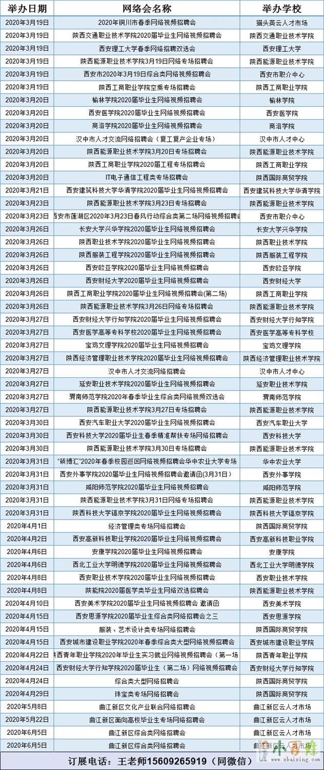 | 2020年3月19日 | 西安市2020年3月19日综合类网络视频招聘会 | 西安市职介中心 |