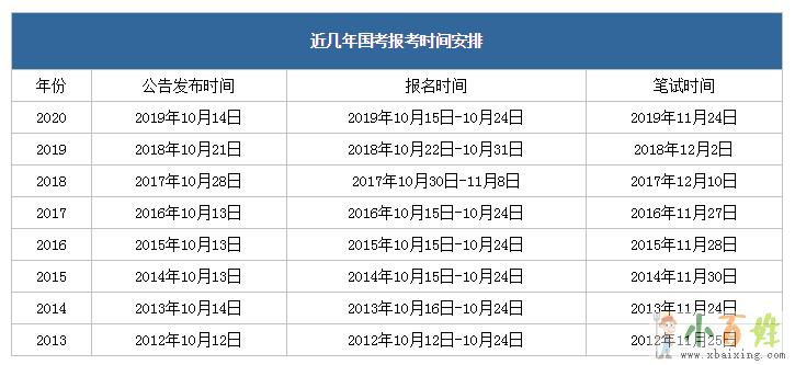 从表中可以看出:国考公告会在报名前一两天发布,考生可充分利用这段时间仔细查阅公告和报考指南,以确定自己可以报考哪些岗位x.b.a.i.x.i.n.g.c.o.m。笔试时间主要集中在11月最后一个周末或12月第一个周末,想要提前备考,可以据此日程安排复习计划。